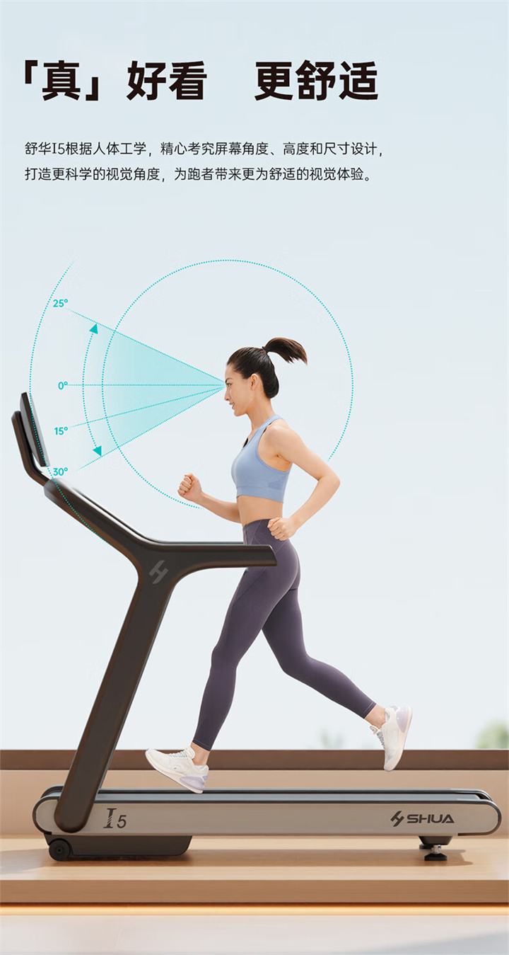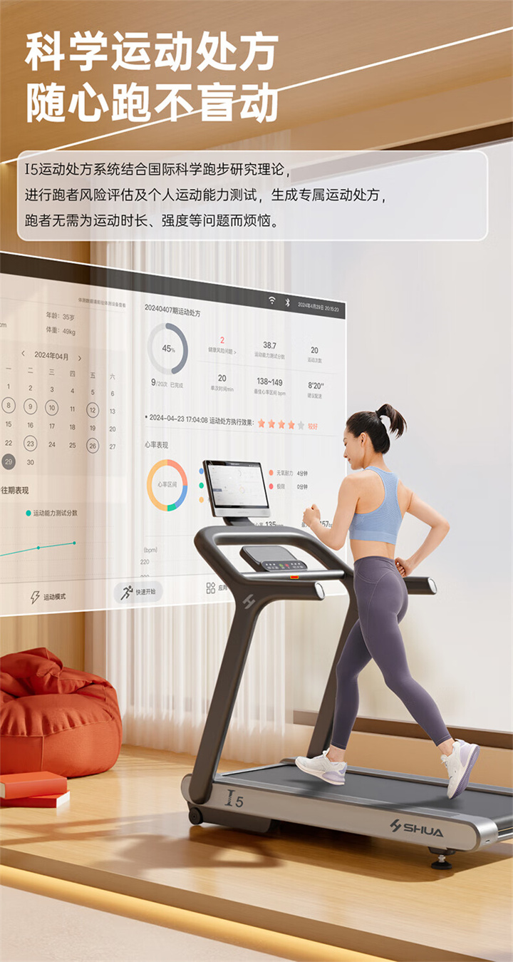 舒華I5智能家用跑步機是由舒華體育聯(lián)合中國體育科學(xué)學(xué)會(huì )、上海體育大學(xué)運動(dòng)科學(xué)學(xué)院教授陸大江等權威機構、專(zhuān)家共同研發(fā)設計。獨特之處在于它結合國際科學(xué)跑步研究理論,能夠針對不同用戶(hù)進(jìn)行運動(dòng)能力測試,并根據測試結果生成因人而異的有氧運動(dòng)處方。這意味著(zhù)每個(gè)用戶(hù)都能得到一個(gè)適合自己的運動(dòng)方案,從而更好地達到運動(dòng)效果。這一創(chuàng )新技術(shù)可以確保用戶(hù)在運動(dòng)過(guò)程中能夠保持在最佳的區間狀態(tài),從而提高運動(dòng)安全性和有效性。