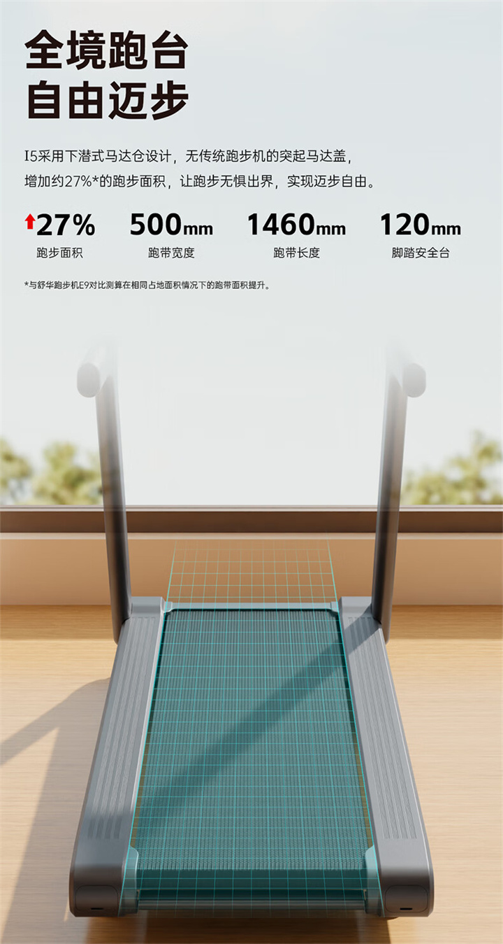 舒華家用跑步機SH-T5100持續馬力達1.25HP,具有500×1350mm的跑臺,運用無(wú)線(xiàn)心率接收模塊監測心率,運用6位硅膠減震設計,最大承重是126kg,可以滿(mǎn)足大多數家庭的使用。