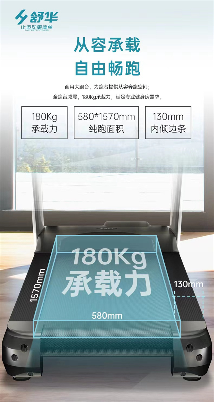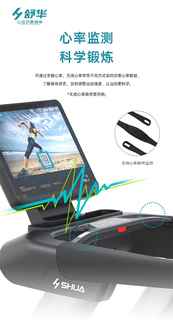 舒華商用跑步機SH-T8919采用t2.2mm黑鉆紋(可選配:t2.4免維護跑帶)的跑帶,,選用手握心率測試 自帶心率帶及增加心率控速(HRC)程序模塊、接觸式心率感應測量心跳等數據,跑步面積達580×1570mm,可承受180kg的使用者使用。